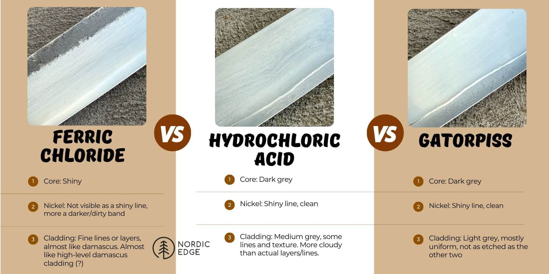 In this test, we took one steel, finished three blades, and etched each one using a different etchant. The results were surprisingly different, and we think it’s a great example of how much room there is to experiment.